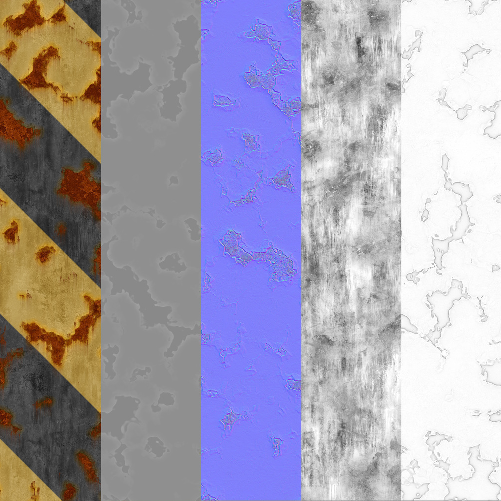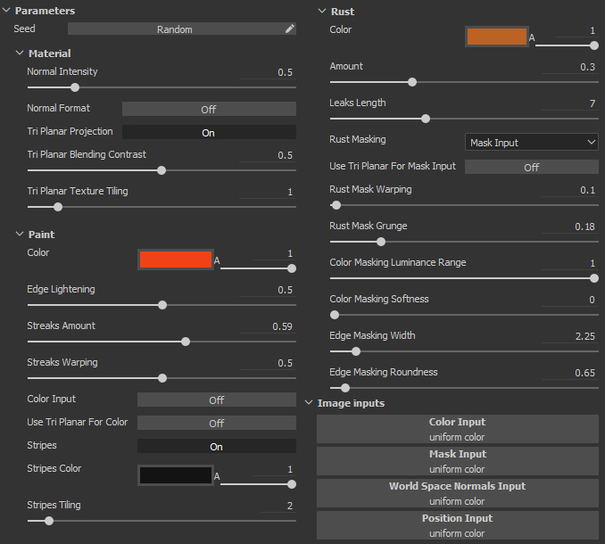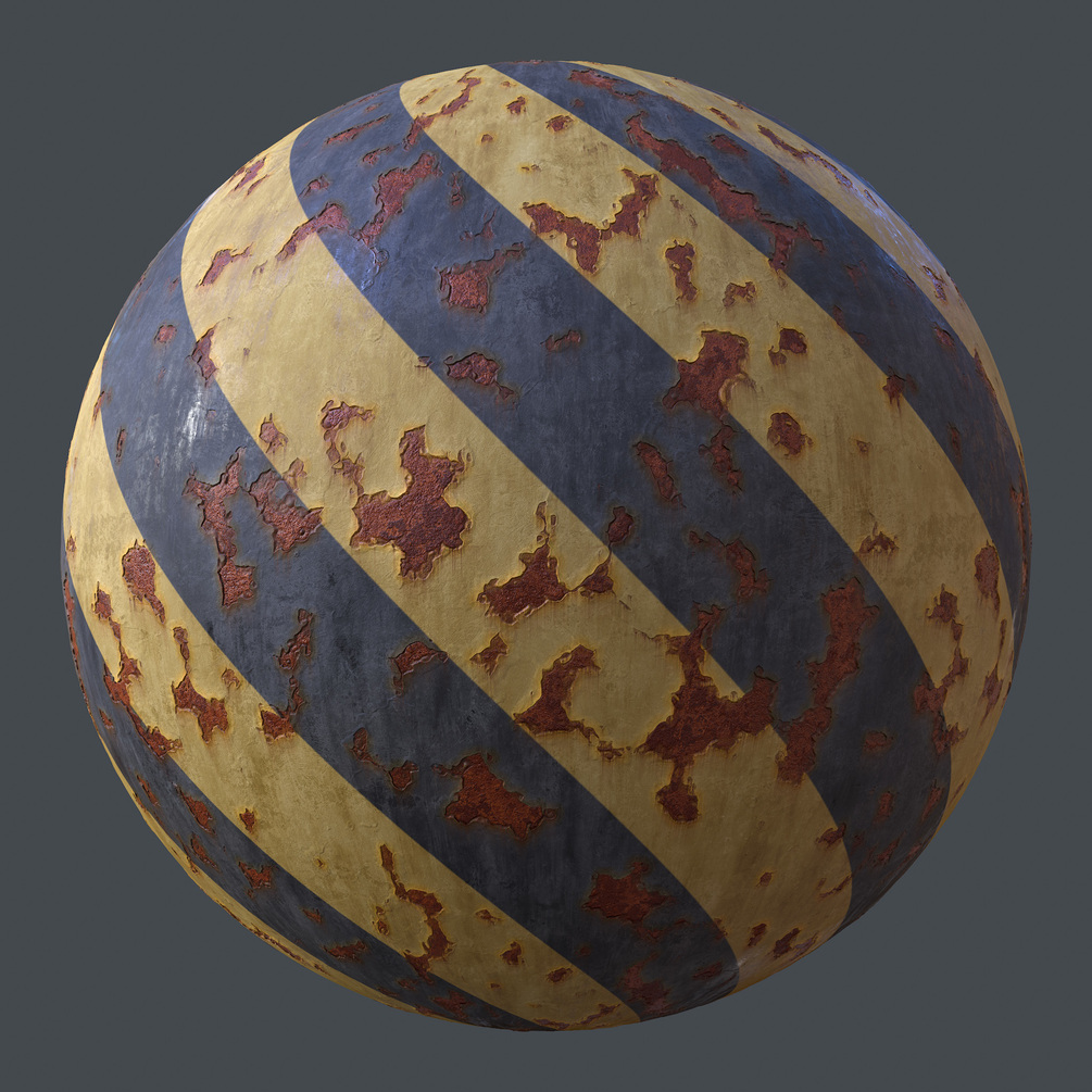 Material is very flexible. Paint and rust colors, rust amount, leaks and streaks are adjustable. Paint can use image input and rust can use mask input. Leaks follow gravity when tri-planar mode is enabled.